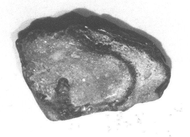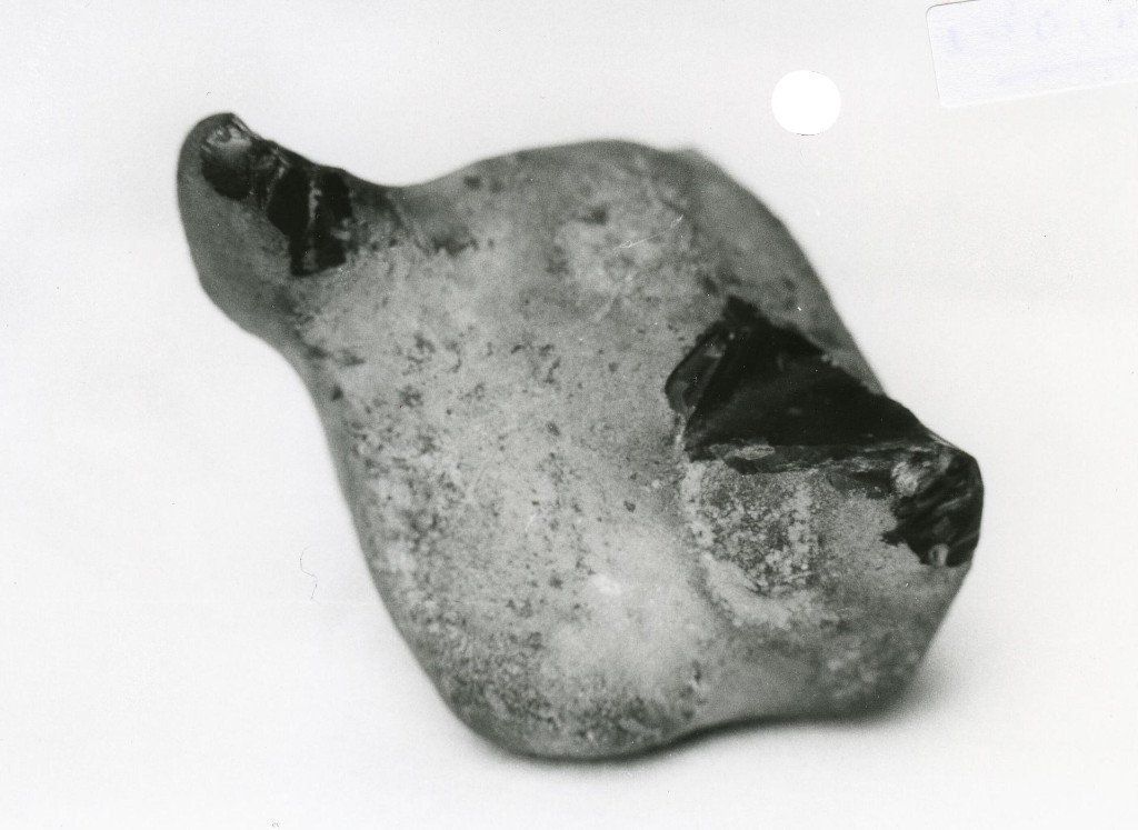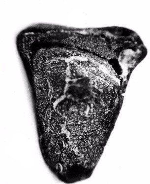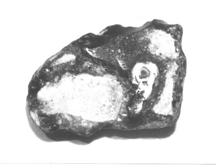 4. Ein versteinerter Knochen, der deutliche Beilhiebe aufweist. Es ist sogar noch der Schliff des Beils erkennbar.
